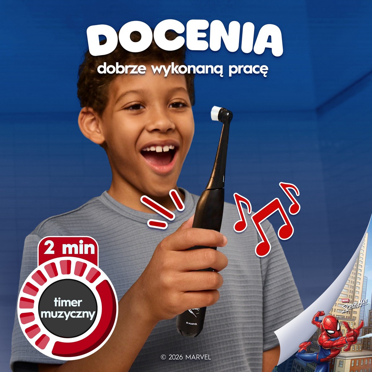 Edycja Spider-Man z oryginalną grafiką Marvela motywuje dzieci do regularnego szczotkowania. Po zakończonym myciu szczoteczka odtwarza wesołą melodię, która zachęca do dbania o higienę każdego dnia.