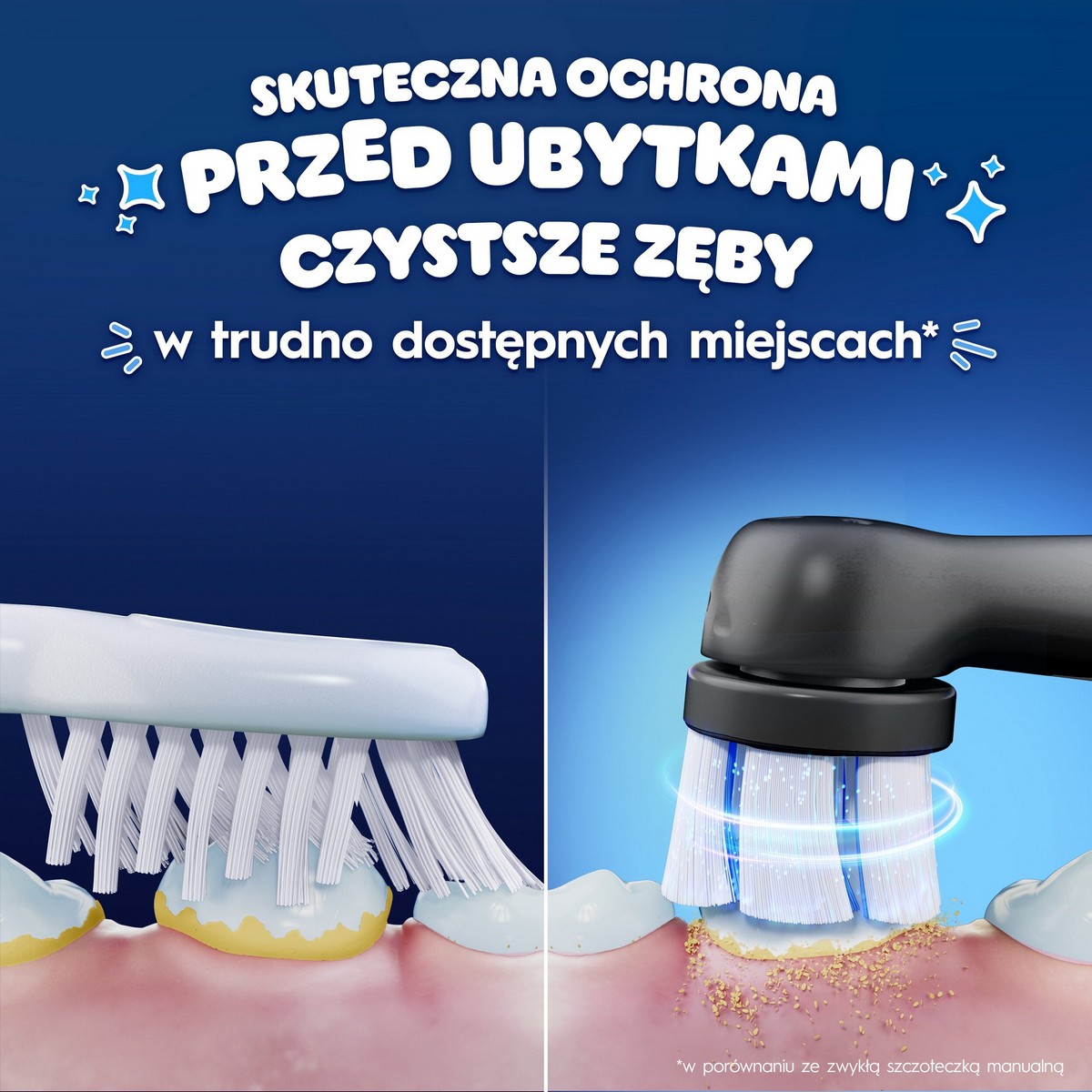 - Mikrowibracje i magnetyczny napęd iO – wyraźnie skuteczniejsze usuwanie płytki niż szczoteczka manualna.