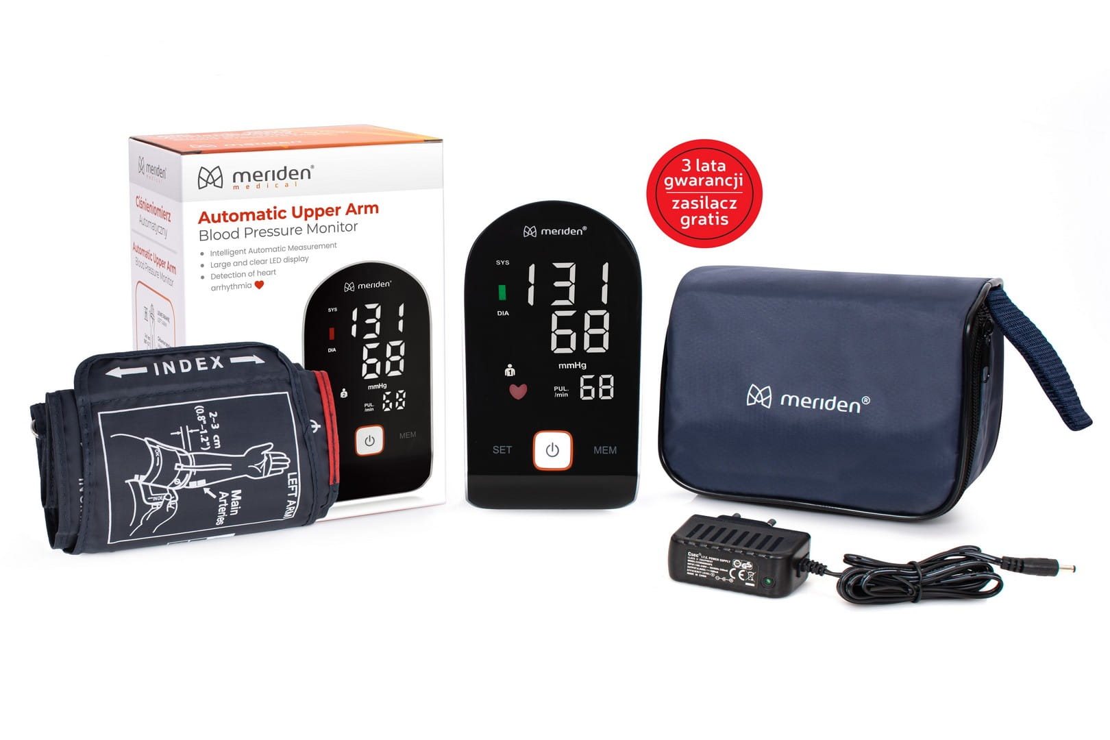 Urządzanie charakteryzuje się wielofunkcyjnością. Oprócz pomiaru ciśnienia, urządzenie dodatkowo klasyfikuje wyniki w odniesieniu do norm WHO, dzięki temu użytkownik ma możliwość porównania swojego wyniku do ogólnie przyjętej skali. Dodatkowo urządzenie wykrywa nieregularne bicie serca, o czym informuje ikona w kształcie serca na wyświetlaczu. Gdy zauważamy, że symbol po dokonaniu pomiaru będzie migał, należy udać się do lekarza, gdyż nieregularne bicie serca (arytmia) może być zagrożeniem życia dla pacjenta. Pojemna pamięć ciśnieniomierza Meriden gwarantuje zapamiętanie 90/90 pomiarów mierzonych u dwóch osób