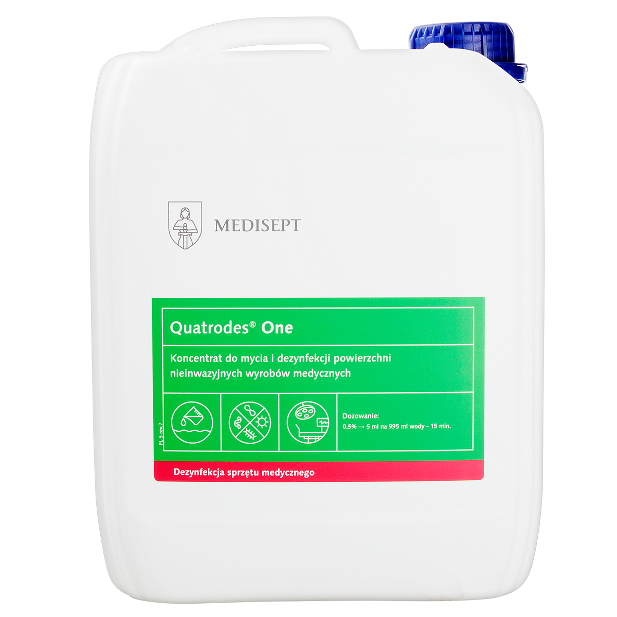 Quatrodes One to wydajny koncentrat do jednoczesnego mycia i dezynfekcji nieinwazyjnego sprzętu medycznego jak unity, łóżka i fotele zabiegowe, stoły operacyjne, aparatura medyczna. Ze względu na wysoką tolerancję materiałową idealnie nadaje się do dezynfekcji materiałów obiciowych oraz wyrobów z tworzywa ABS, szkła, porcelany, gumy, stali szlachetnej oraz aluminium, niklu i chromu. Zalecany jest także do dezynfekcji poprzez zanurzenie oraz do wyrobów medycznych ze szkła akrylowego. Innowacyjna formuła oparta na synergii surfaktantów i technologii nano-micelli zapewnia szerokie spektrum działania w krótkim czasie i wyjątkowe właściwości myjące. Nie zawiera aldehydów i fenoli, dzięki czemu nie wywołuje reakcji alergicznych i nie odbarwia powierzchni. Nie wymaga spłukiwania. Posiada przyjemny, kwiatowy zapach. Posiada pozytywną opinię producenta sprzętu medycznego Famed.