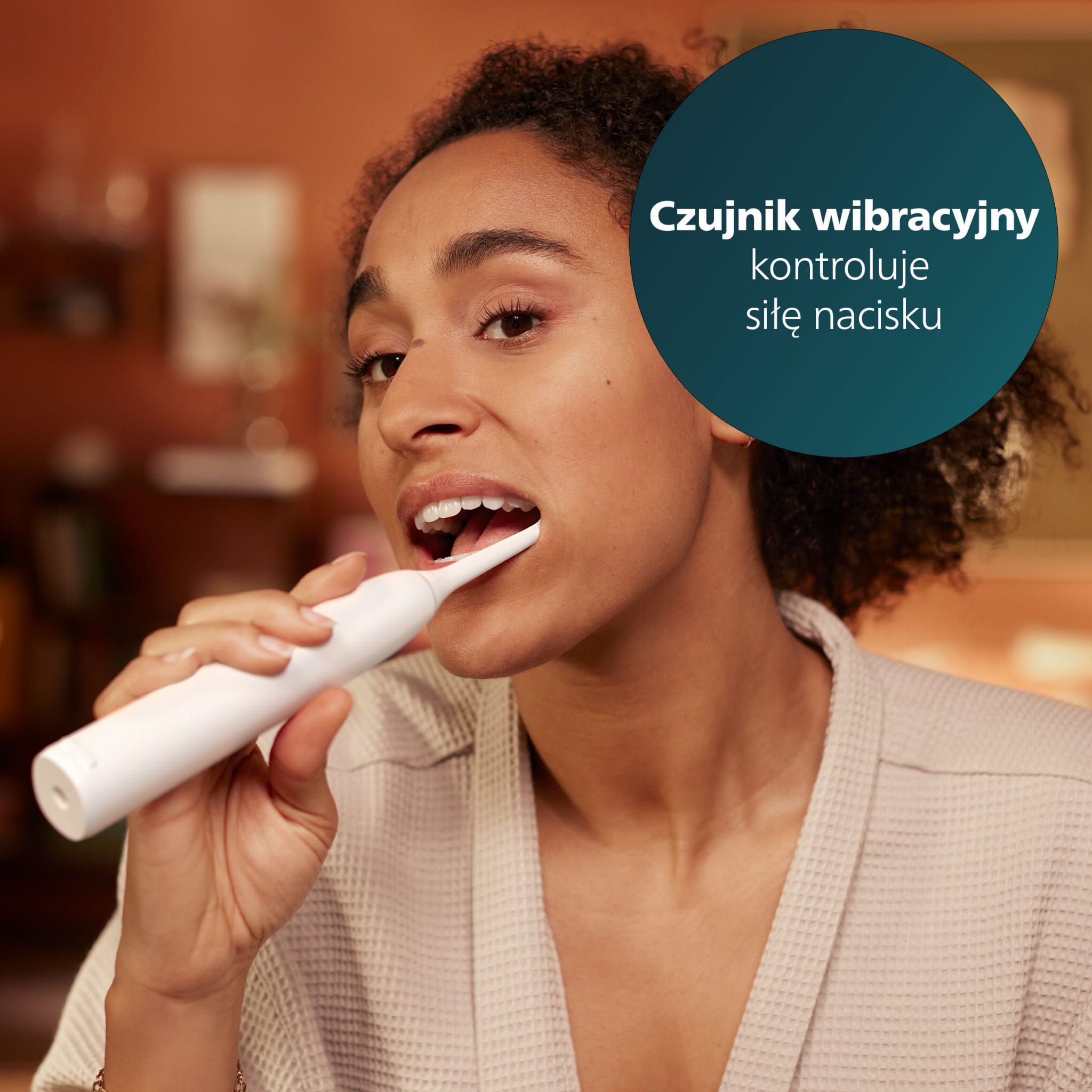 Możesz nie zauważyć, kiedy szczotkujesz zęby zbyt mocno, ale ta szczoteczka to zrobi. Inteligentny czujnik optyczny precyzyjnie wykrywa nadmierny nacisk podczas szczotkowania i informuje o tym za pomocą pulsującego dźwięku, jednocześnie redukując wibracje. Zawsze będziesz wiedzieć, kiedy dostosować szczotkowanie, a Twoje dziąsła pozostaną chronione.