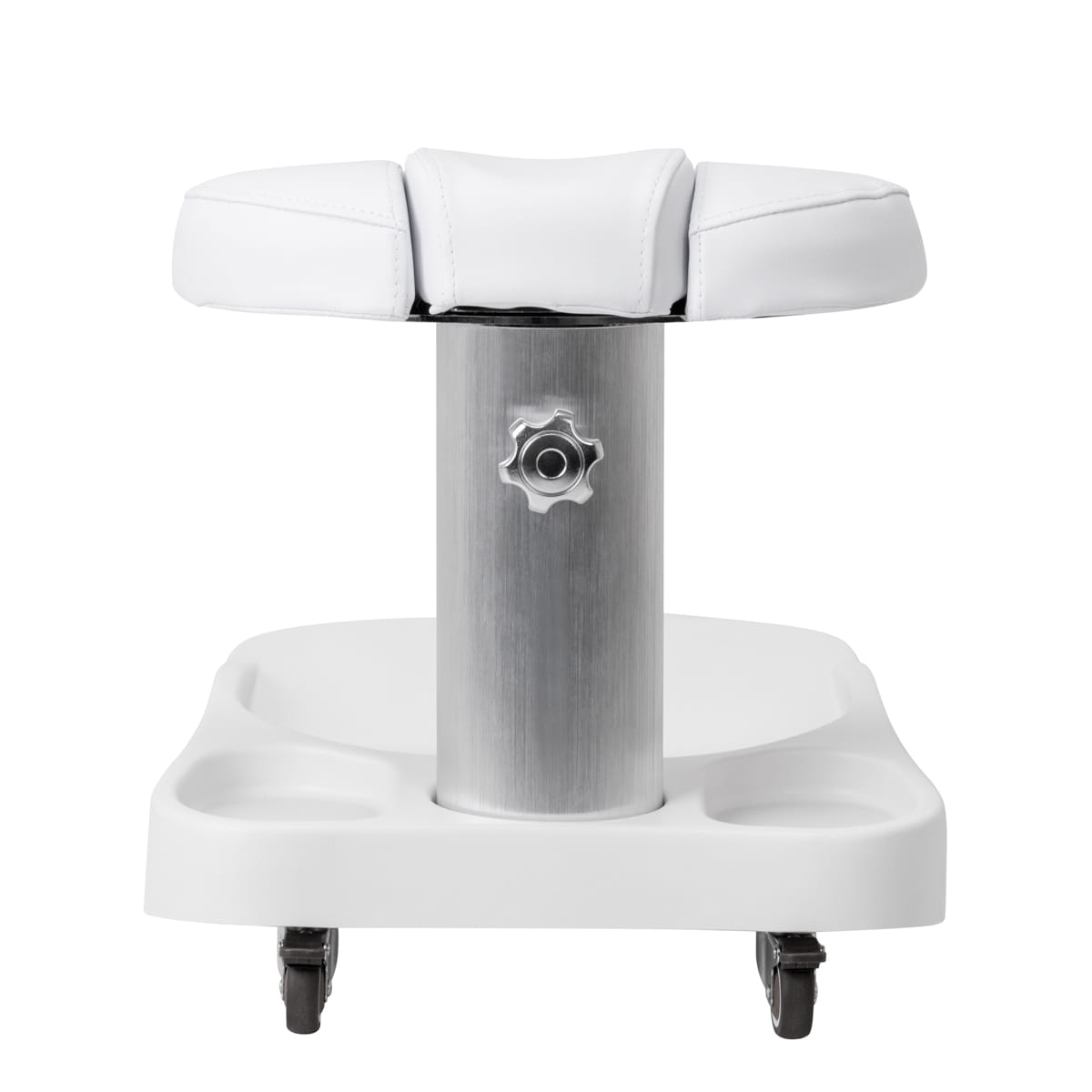 Podnóżek składa się z trzech części, z których środkowa jest wysuwana. Ręczna regulacja wysokości umożliwia podniesienie jej o maksymalnie 20 cm. Wszystkie elementy podnóżka obite są skórą syntetyczną, co zapewnia odporność na wilgoć oraz łatwość utrzymania czystości. Dzięki temu wózek można dostosować do indywidualnych potrzeb użytkownika, co sprawia, że jest doskonałym rozwiązaniem zarówno podczas zabiegów kosmetycznych, jak i podologicznych, zapewniając komfort i precyzyjność pracy w różnych pozycjach.