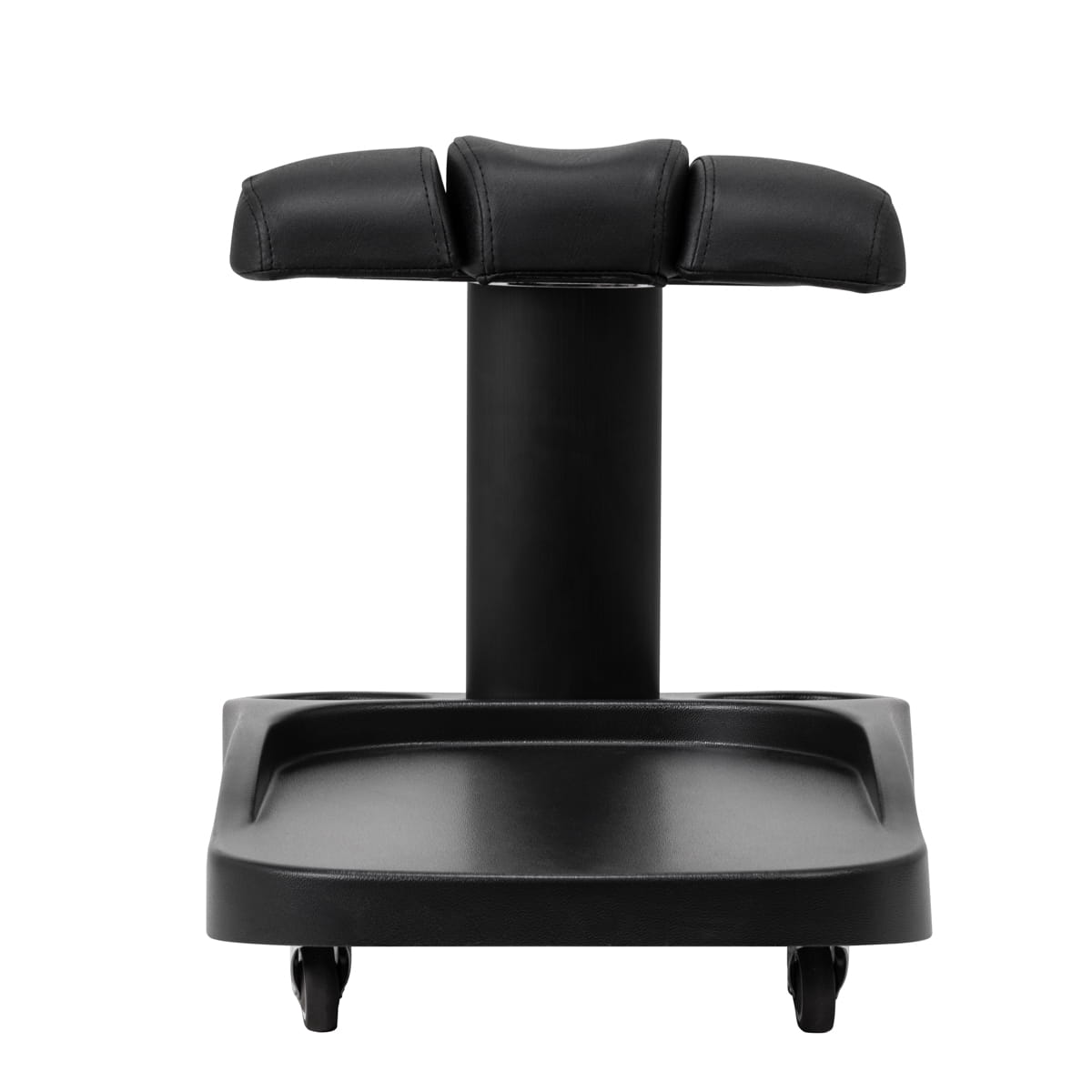 Podnóżek składa się z trzech części, z których środkowa jest wysuwana. Ręczna regulacja wysokości umożliwia podniesienie jej o maksymalnie 20 cm. Wszystkie elementy podnóżka obite są skórą syntetyczną, co zapewnia odporność na wilgoć oraz łatwość utrzymania czystości. Dzięki temu wózek można dostosować do indywidualnych potrzeb użytkownika, co sprawia, że jest doskonałym rozwiązaniem zarówno podczas zabiegów kosmetycznych, jak i podologicznych, zapewniając komfort i precyzyjność pracy w różnych pozycjach.